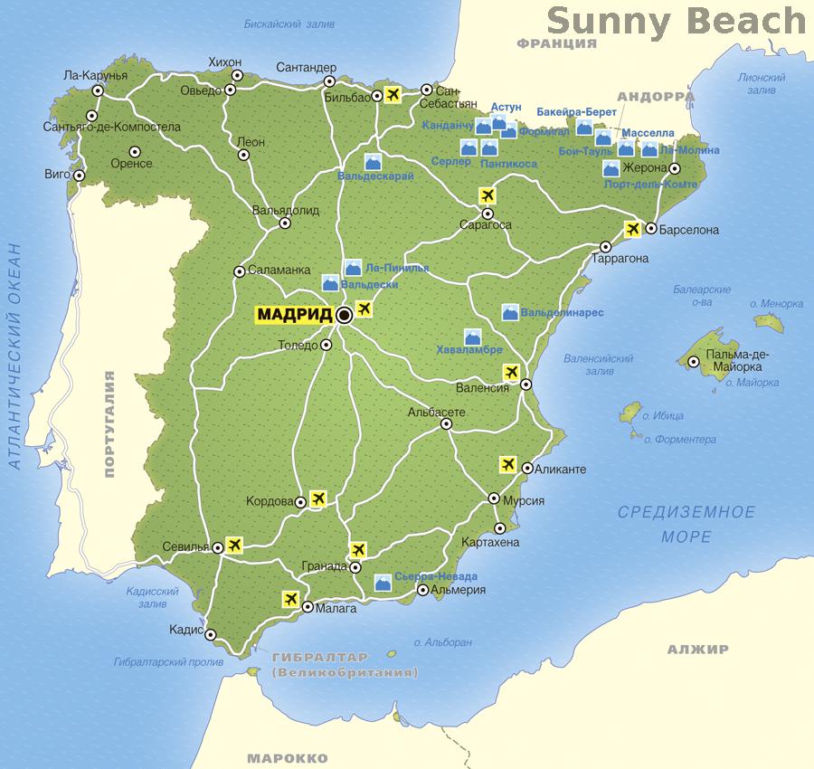 Столица — Мадрид (Madrid). Крупные и популярные города: Барселона, Гранада, Кордова, Севилья, Бильбао и другие.