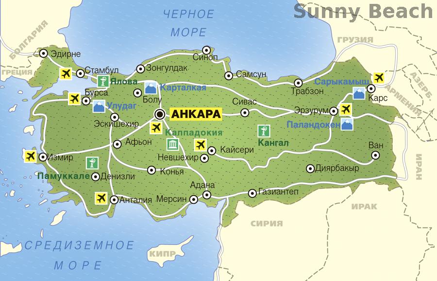 Столица — Анкара (Ankara), крупные города: Стамбул, Измир, Адана, Бурса, Эрзурум.